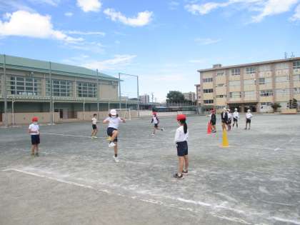 外の体育では「走り高跳び」の学習が始まっています。1組では、自分の跳びやすい方向を探し、はさみ跳びのやり方を確認しました。また、ゴム紐を使って足のあげ方や、歩幅合わせの練習にも取り組みました。今日のバーの高さは約60センチです。少しずつ高いバーに挑戦してほしいと思います。