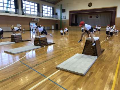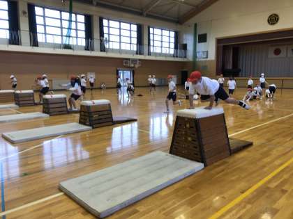 体育では、跳び箱の学習に入りました。今週は、しっかりと両足で踏み切って、跳び箱の前の方に手をつき、足を横に開くことを意識して、「開脚跳び」を練習しました。自分の能力にあった高さを選び、意欲的に練習に取り組むことができました。来週からは、「開脚跳び」の段数アップに挑戦するだけでなく、「かかえこみとび」や「台上前転」などいろいろな技に挑戦していきます。