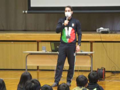 イタリア人のアレッシオ先生による国際交流の授業を受けました。イタリアについて初めて知ることが多く、子どもたちは興味津々に話を聞いていました。イタリアの基本的な情報から学校について、食文化について知ることができました。これを機に、世界の国々に関心をもってもらえればと思います。