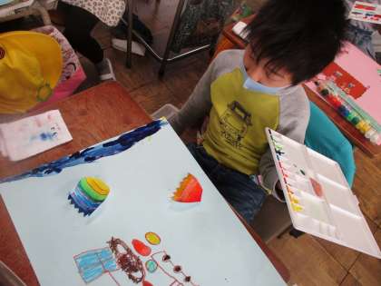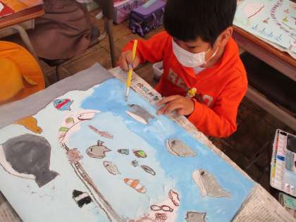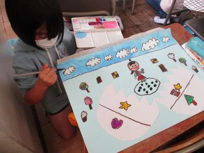 不思議な形や模様をした卵から,自分が想像した世界を楽しく表現することができました。水彩絵の具やクレヨン,身辺具などを活用し,一生懸命に作品を作りました。作品を通して,自分を表現する素敵な機会となりました。
