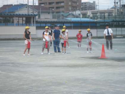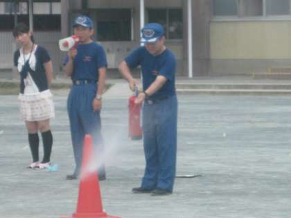 運動場に避難した後、消防署の方から消火器の使い方の説明を受けました。6年生の代表児童が実際に消火器を使って訓練をしました。