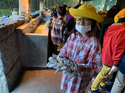 美味しく蒸し焼きになることを、みんな祈るように見守っています。
