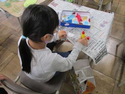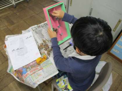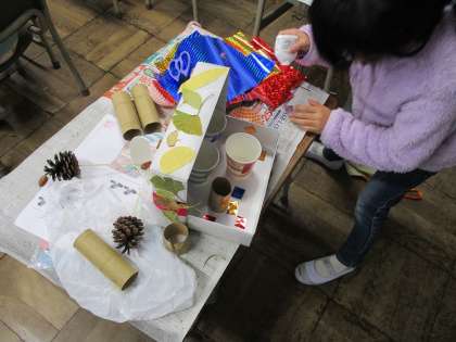 「あきの おもちゃをつくろう」でどんぐりやまつぼっくりなどを使って秋のおもちゃを作りました。めいろや的あて、マラカスなどいろいろなおもちゃを作ることができました。みんなでおもちゃ大会をするのが楽しみです。