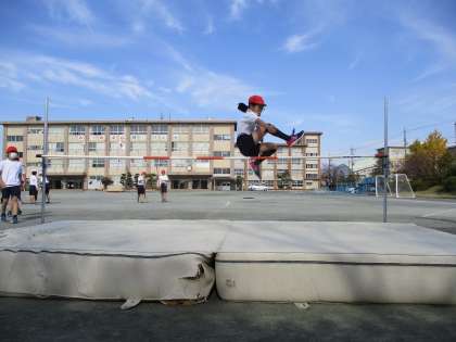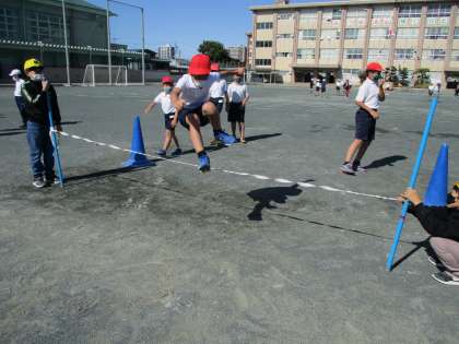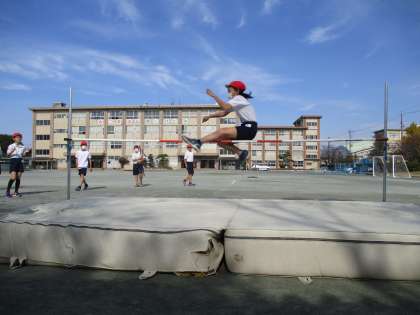 体育の走り高跳びでは、一人ひとりが自分のめあてを持ち、ふみ切り方や助走の仕方を工夫して、より高く跳べるように一生懸命練習しています。60cmから練習をはじめ、少しずつ上達していき、前回は105cmの高さまで跳ぶことが出来た人もいました。どこまで自分の記録が伸びるか、とても楽しみですね。