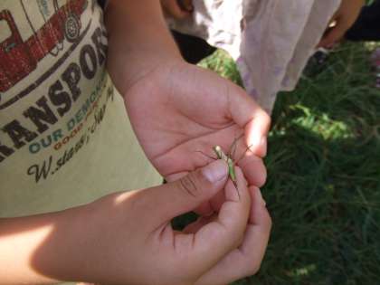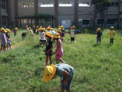 なかよし広場で虫とりをしました。バッタやチョウチョを見つけました。