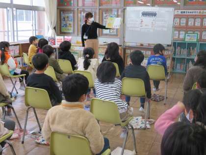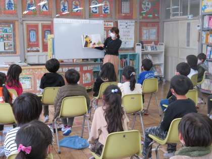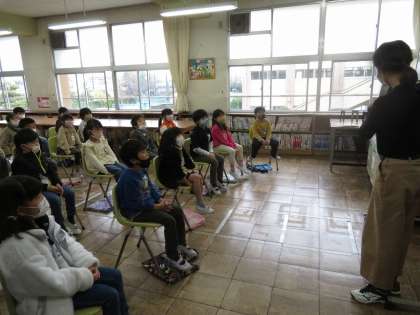 むかしばなしをテーマに司書の先生によるブックトークを行いました。日本のむかしばなしだけでなく、外国のむかしばなしも紹介してもらいました。小人や大男が出てくるおはなしや、たくさんの兄弟が出てくるおはなしなど、たくさんのおはなしがあることを教えてもらいました。また、むかしばなしの本を借りて、ビンゴをつくるビンゴカードをもらい、明日からの図書館での貸し出しがとても楽しみになりました。