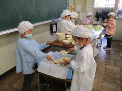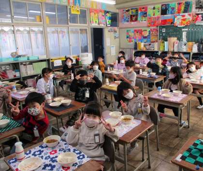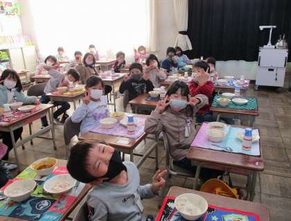 今日の給食はポークカレーとフルーツクリームヨーグルトでした。みんなで協力して準備をして、静かに食べることができました。明日の給食も楽しみです!