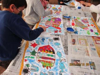 12・15 図工 「たんぽで海を描いたよ」 1年生
