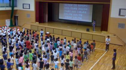 また、1年生から3年生は、縦割り班で親子一緒に踊る「織姫音頭」の振付を覚え、家庭で保護者の方に教えてあげられるように練習しました。