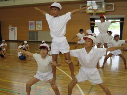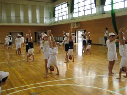 組立体操の練習も、3人組となりました。土台となってしっかり支える子、上の方で微妙なバランスをとる子、どの子も熱心に取り組んでいます。全員の気持ちが1つになって、完成といえます。引き続き励ましながら練習を重ねていきます。
