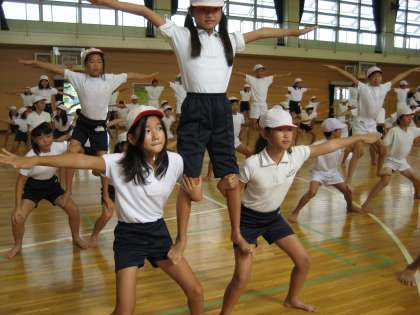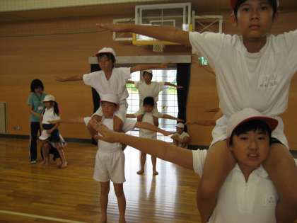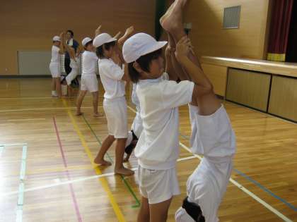 組立体操の練習に励んでいます。練習を重ねていくうちにペアとの息も合い、技も決まるようになりました。