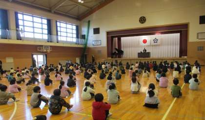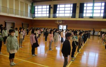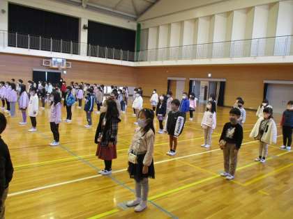 今日は終業式でした。1年生と6年生は屋内運動場に集まって式に参加しました。校長先生の話をとても静かに聞いたり、校歌を歌ったりすることができました。