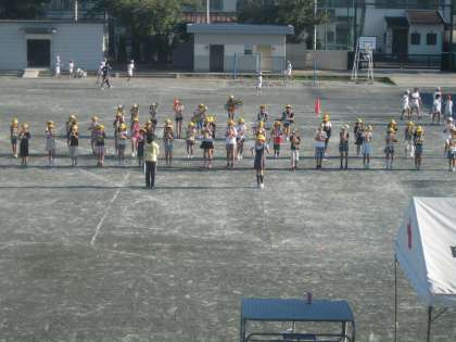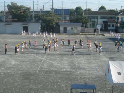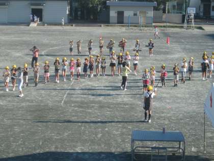 運動会に向けて、運動場で隊形移動の練習をしました。位置を確認しながら演奏しました。