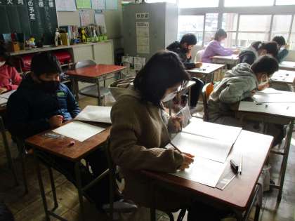 朝から雪の積もった道を登校してきた子どもたちは1・2時間目に学力検査に取り組みました。これまでの学習の成果を発揮するために、最後まであきらめずに問題を解くことができました。
