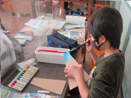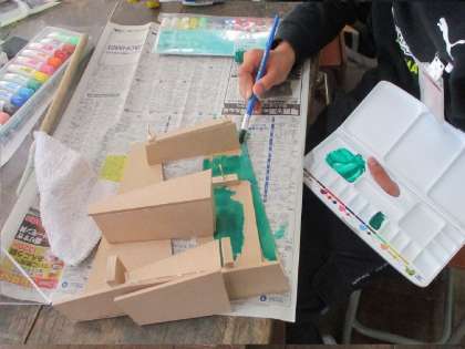 図工の作品を一生懸命に作っています。ヒートンを使って鍵をかけられるようにしたり、くぎを打って、板が動くようにしたり、工夫をしています。