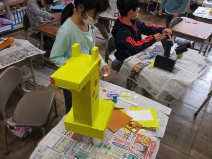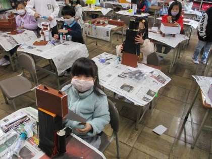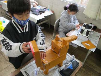 箱に折り紙を張ったり、模様や毛糸などをつけたりして、動物づくりの仕上げをしました。折り紙を張る際には、下の箱が見えないように工夫して張ることができました。