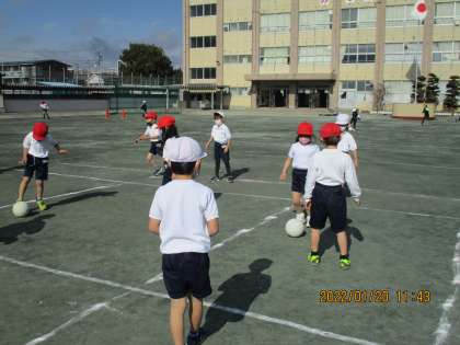 ボールけりゲームでは、「たまごわりサッカーゲーム}を行いました。赤チームと白チームに分かれて楽しくゲームをしました。ボールをけって味方の子にパスが通ったら1点入ります。敵チームは、ボールが通らないようにボールをよく見て止めます。はじめは、蹴る力も弱く、狙ったところにパスができなかったけれどだんだん強いボールを蹴ることができるようになりました。