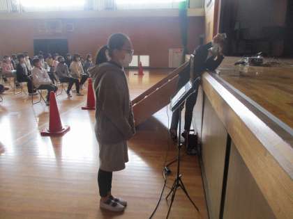 今日は屋内運動場に集まって、南部中学校のオンライン見学会を行いました。校舎内の様子を見せていただいたり、先輩の声を聞かせていただいたりしたことで、中学校生活への期待が高まった様子でした。また、会の最後には、各小学校の代表児童のあいさつがありました。向山小の代表として、堂々と話す姿が立派でした。