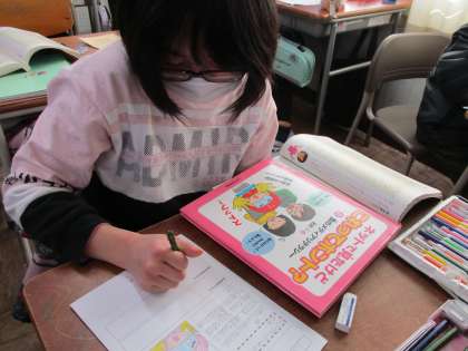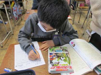 国語では、相手に伝わりやすいように表現を工夫して、ペア学年の3年生におすすめの本を紹介するためのパンフレットをつくっています。