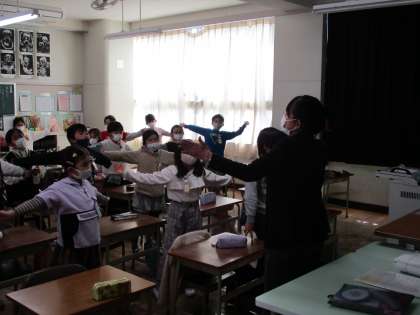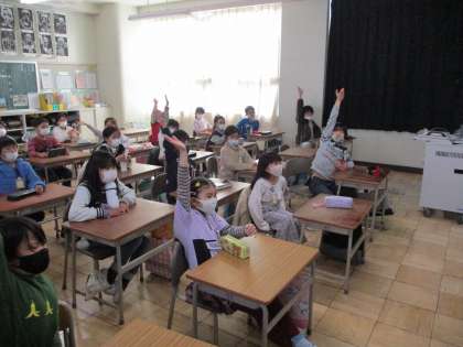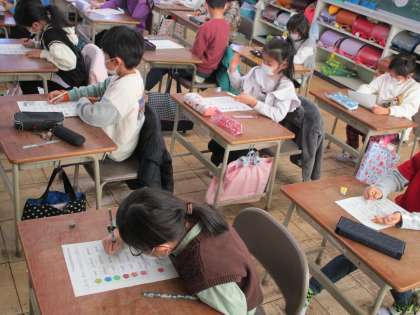 今年度最後の英語活動がありました。色や数字、果物の名前などの復習をしました。大きな声で歌ったりできないのが残念ですが、ゼスチャーやゲーム、プリント学習で楽しみました。