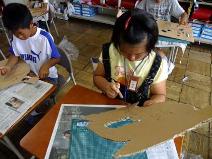 (下):図工では、「光のおくりもの」を学習しています。段ボールカッターを使って思い思いの形を切り抜いています。この後、カラーセロハンを貼っていきます。
