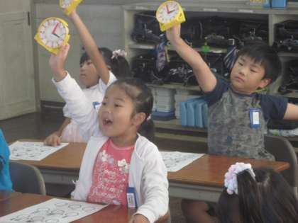 10・1 時計の勉強をしました。(1年) 公開日 2010/10/01 更新日 2010/10/01 1年 時計の勉強をしました。何時?何時半?読めるようになったかな?長い針と短い針の位置に気をつけてね。
