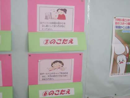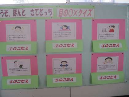 10.6 目に関する○×クイズ 公開日 2010/10/06 更新日 2010/10/06 保健室 今、各学年順番に視力検査を行っています。保健室前には、「目に関する○×クイズ」が掲示してあります。クイズを楽しみながら、目の大切さを知ってもらいたいと思います。