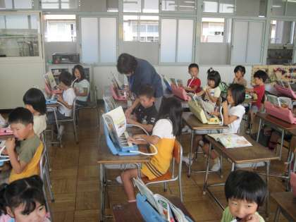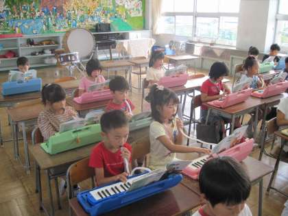 1年生は、音楽の時間が大好きです。大きな声で歌ったり、鍵ばんハーモニカを演奏したりしています。