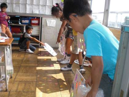 (2組)図工の「光のおくりもの」の学習で、色セロハンを貼って作品を完成させました。光にかざしたときの様子も、きれいに映りましたね。