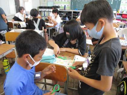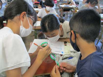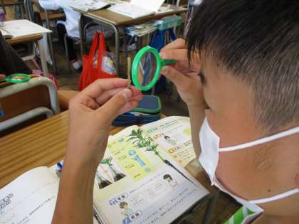 ホウセンカの根を青い染色液にひたし、根・くき・葉を虫メガネを使って、くわしく観察しました。予想では、「くきだけ」や「根とくき」など様々な意見が出ましたが、観察を通して、根からとり入れた水は水の通り道を通って体全体にいきわたることが分かりました。