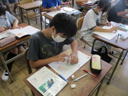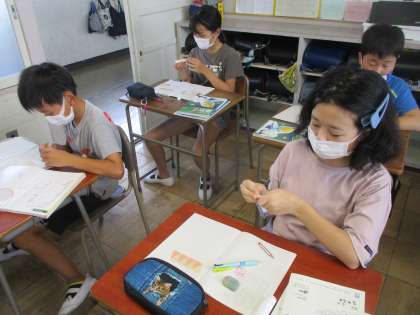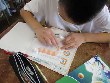 算数の授業では、「円の面積」をやりました。図形を切ってならべ、円の面積を求める公式を導きました。