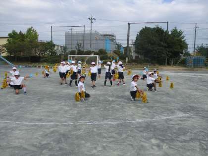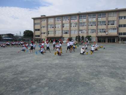 運動会の練習を頑張っています。運動場で隊形移動の練習をしています。本番では、かっこいい演技をおうちの人に見せられるように残りの練習も頑張りましょうね。