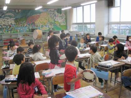 今、1年生はグループで発表したり、いろいろな楽器を使ってみんなで演奏したりして楽しく勉強しています。