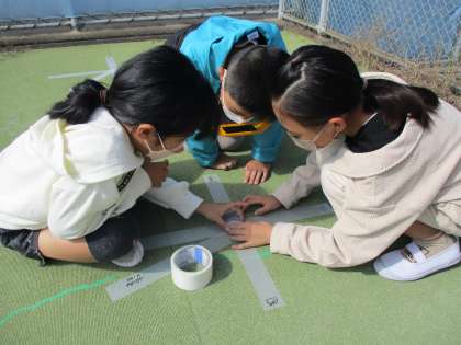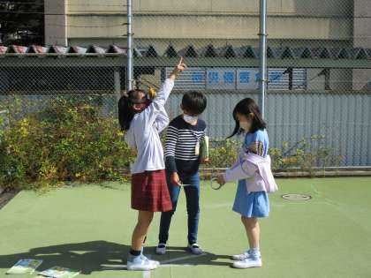 11:00と12:00、14:00の3回、太陽の位置を観察して記録しました。方位磁針も上手に使えました。太陽が東から南を通って西へ動いていることがよく分かりました。