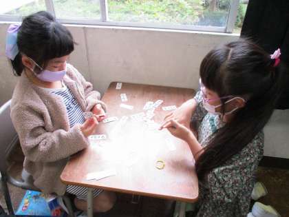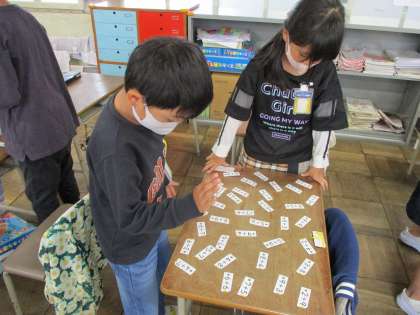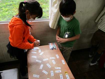算数の授業では、たし算カードを使って、繰り上がりのあるたし算を練習しています。なかま集めをしたり、カードとりゲームをしたりして楽しみながら何度も計算練習に取り組みます。