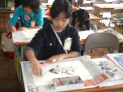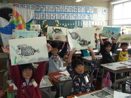 1・2時間目の図工の時間に、紙や色々な材料で作った生き物に、インクをつけて刷りました。一人一人ががんばって、生き生きとした作品を仕上げました。教室の中が、素敵な生き物ワールドになりました。