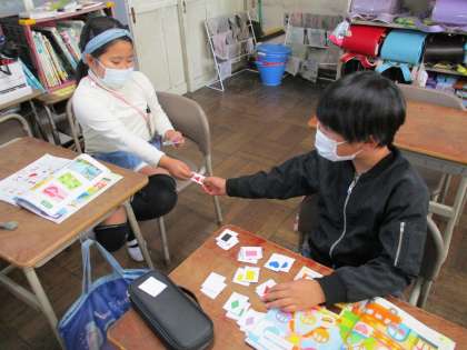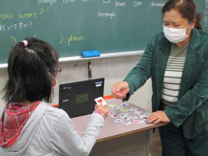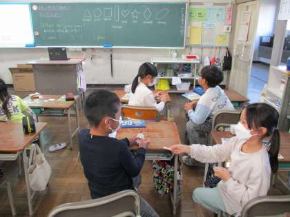 英語の時間に、いろいろな形を英語で言う学習をしました。その後、「What do you want?」「Red star,please.」などと言って、友達とカードを交換しました。ほしい形をたくさん集めて楽しみました。