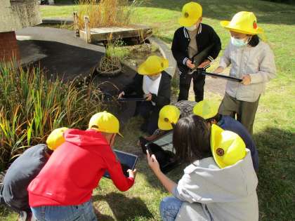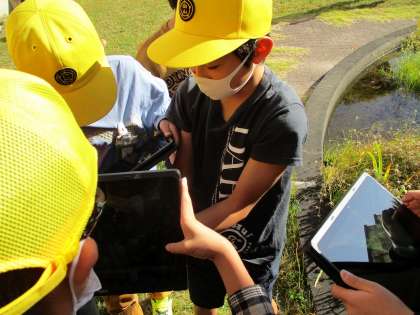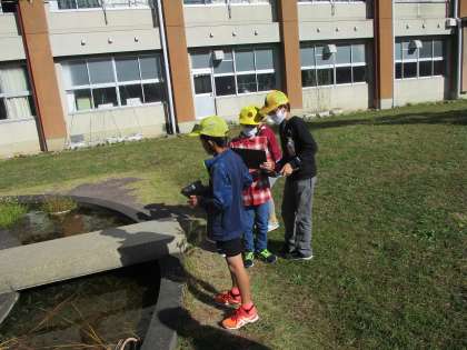 秋の生物や植物の写真を撮り、観察をしました。夏の終わりの頃と比べて、生物の数や植物の色などのちがいに気付くことができました。