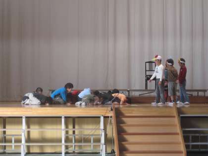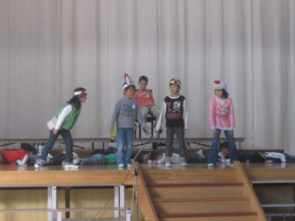 劇団の方に2年生の劇を見てもらいました。自分がセリフを言うときだけでなく、セリフを言う前の準備や、言った後の動作の大切さを教えていただきました。