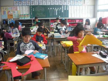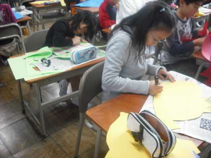 今日、学習発表会でかぶる魚のお面作りをしました。