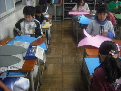 自分だけの魚のお面をつくろうとみんな一生懸命取り組んでいました。