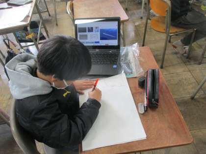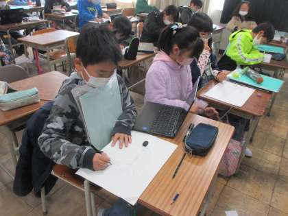 今日は3学期に行う版画の下書きをしました。図鑑を見ながら自分が版画で表したい海の生き物を選び、大きく描きました。どんな作品になるか楽しみです。