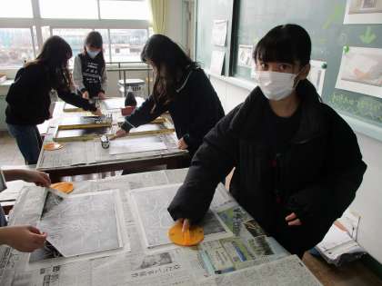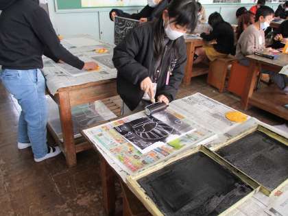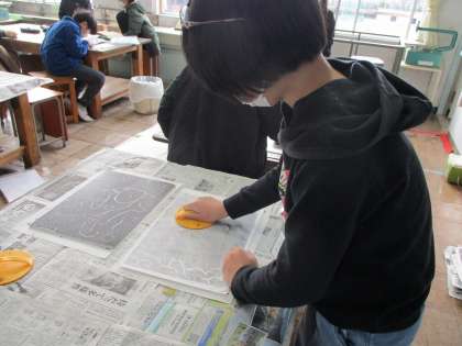 初めての彫刻刀で彫った作品をすりました。写った絵を見てとてもうれしそうでした。