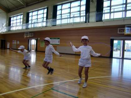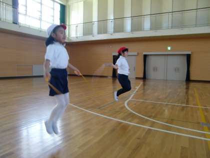 もうすぐ、縦割り班の縄跳び大会。1年生は、体育でも縄跳びにチャレンジしています。前跳び、後ろ跳び、駆け足跳びができるようになったら、綾跳び、交差跳び、二重跳びにも挑戦してみよう!