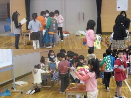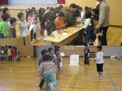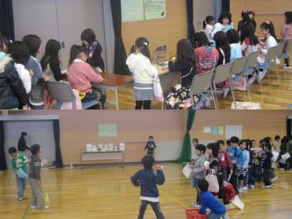 2・3時限目に屋内運動場でフェスティバルを行いました。グループごとに考えたゲームを準備し、1年生を招待しました。1年生に楽しんでもらおうと、やり方やルールを説明する2年生は輝いていました。