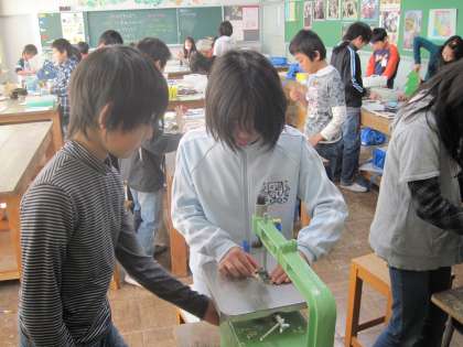 12.17 糸のこぎりで切ったよ(5年生) 公開日 2010/12/17 更新日 2010/12/17 5年 板を切るのは難しいですが、頑張って切っています。切った後、紙やすりで切り口をきれいにします。
