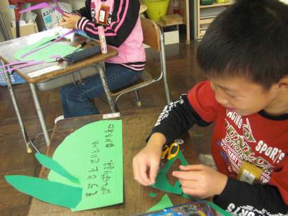 教室に帰ってから、工作用紙をうさぎの形にして、3学期のめあてを作りました。