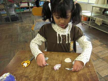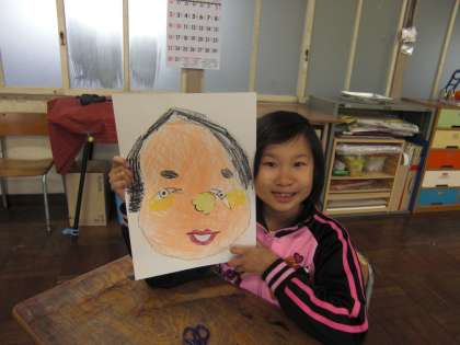 目隠しをしながら、目、鼻、口、まゆの部品を貼りつけて、ふくわらいを楽しむことができました。