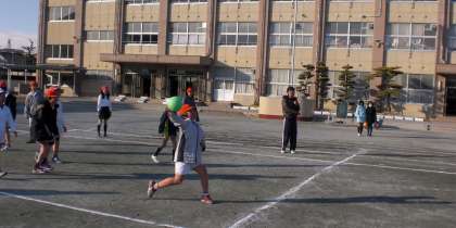 王様ドッジとは、コートを3つに分け、ボールを2つ使って行うゲームです。男子と女子に分かれて王様を狙い、みんな必死になってゲームに臨んでいました。
