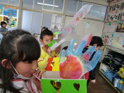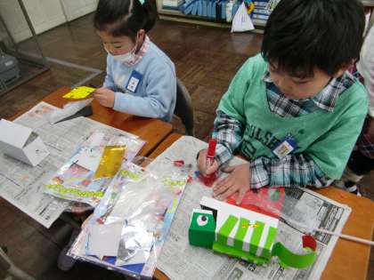 図工「むくむくニョキニョキ」では、どんな物が飛び出したらおもしろいかを考えてつくりました。